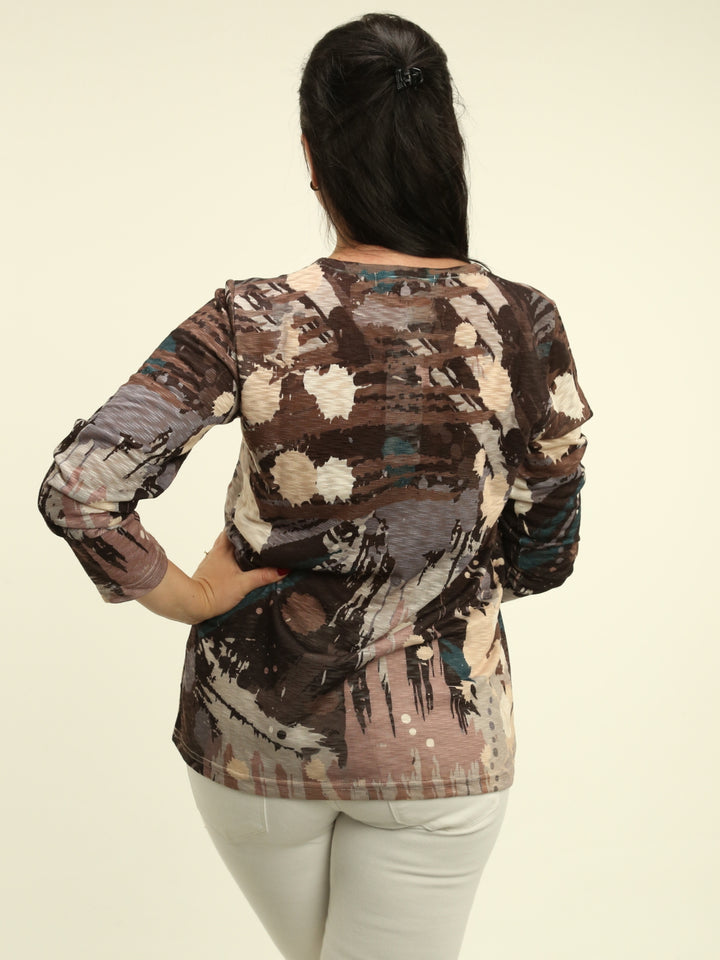 Turn your outfit into a masterpiece with our Abstract Splash Print Top — where earthy tones and shimmering rhinestones create wearable art.
