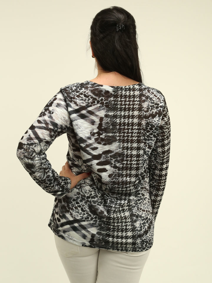 Make an impression in this top—an elegant blend of floral and houndstooth prints with rhinestone accents that combine classic charm and modern versatility.
