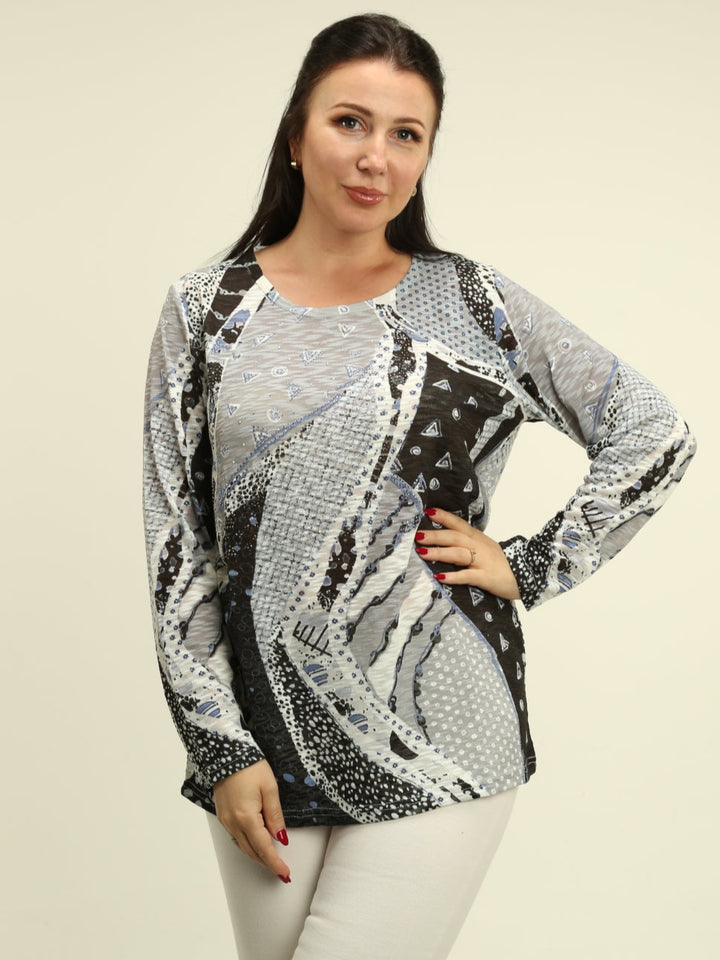 Make a bold statement with the Geometric Print Rhinestone Top—combining a lightweight, comfortable fit with modern flair to elevate any outfit effortlessly.